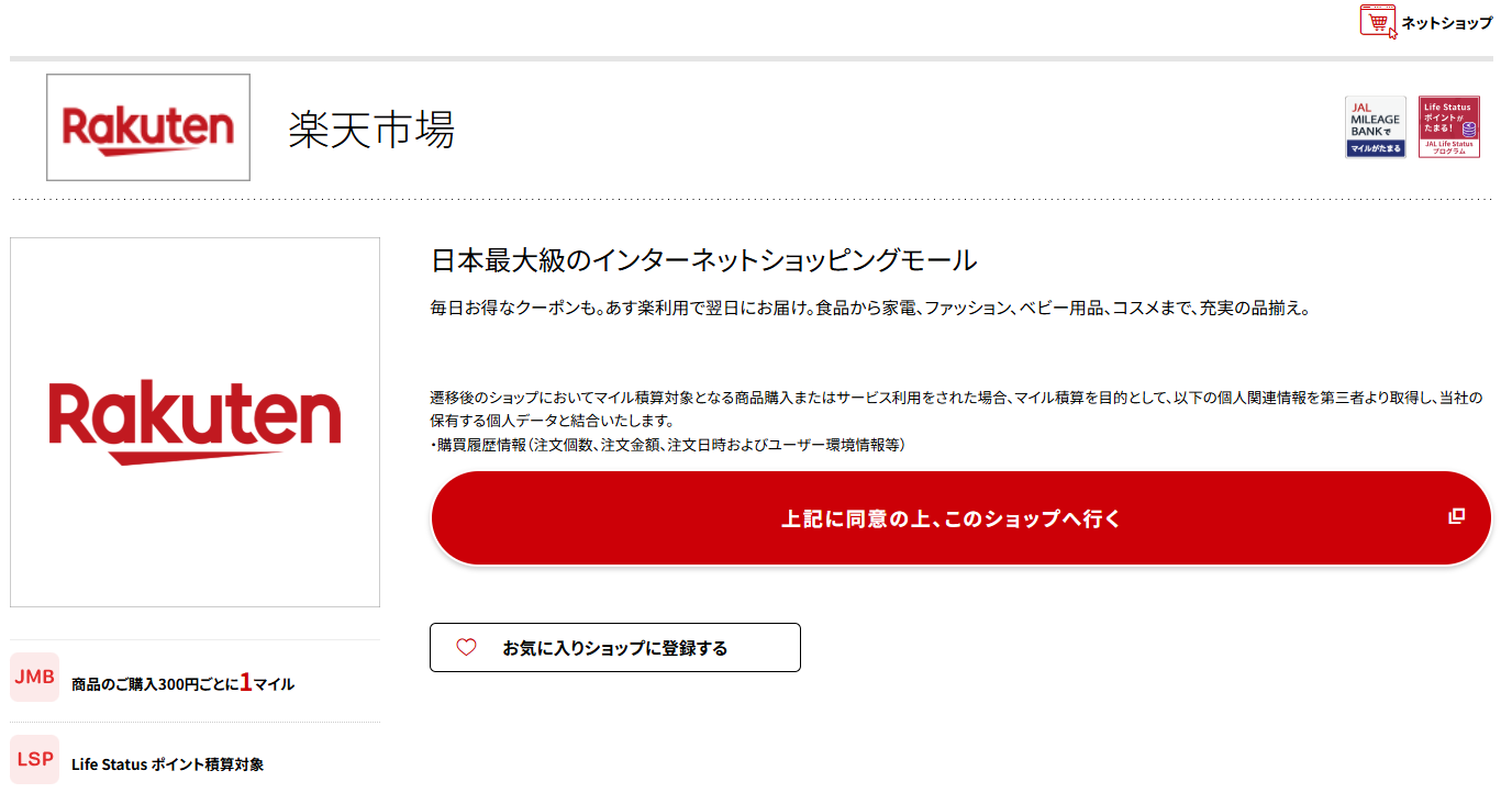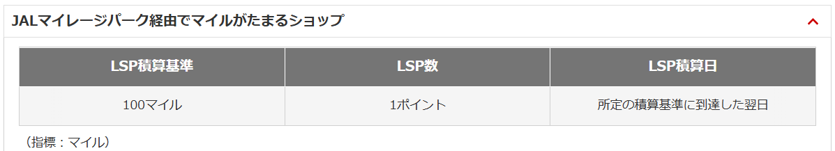 ネットショッピングの際、JALマイレージパークを経由することでマイルがたまり、100マイルごとに1LSPがもらえます。