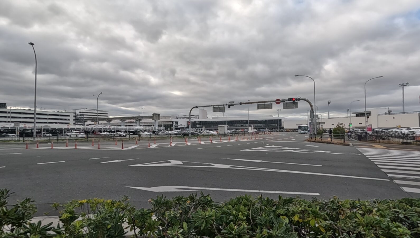 右側の横断歩道から歩いていくと、空港ターミナルへの案内があります。JAL側の北ターミナルに入れます。
