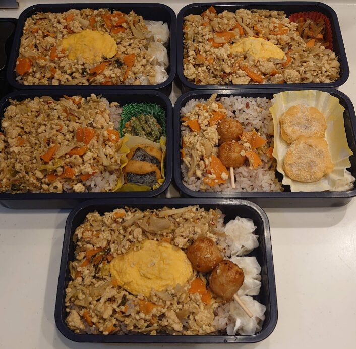 適当な野菜+鶏むねミンチ+適当な調味料で作ったそぼろと、味変用の冷食を詰めています。メニューで悩むことが無いので続けられています。